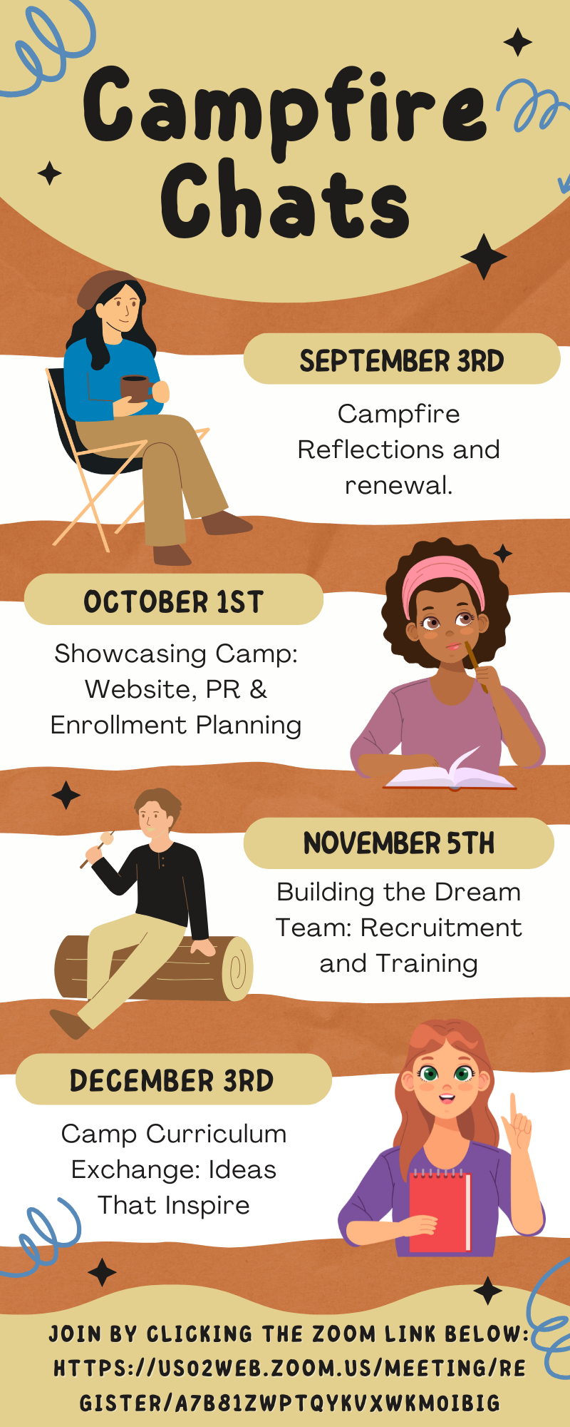 Are you a lay leader or a camp clergyman? Would you like to meet with individuals to help garner ideas and help for your camping ministry? Join Jennifer Morris as we begin our Campfire Chats! Each chat will be about 60 minutes long on Zoom. They will be on the first Wednesday of every month. To register for a chat, click the infographic or button below!